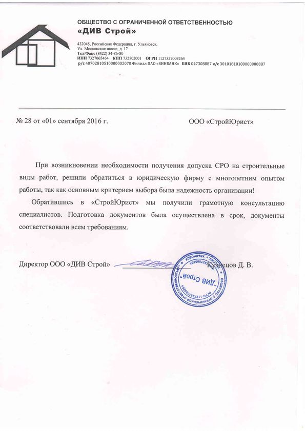 Отзывы клиентов "СтройЮрист" по вступлению в СРО в Нягане
