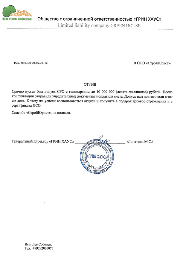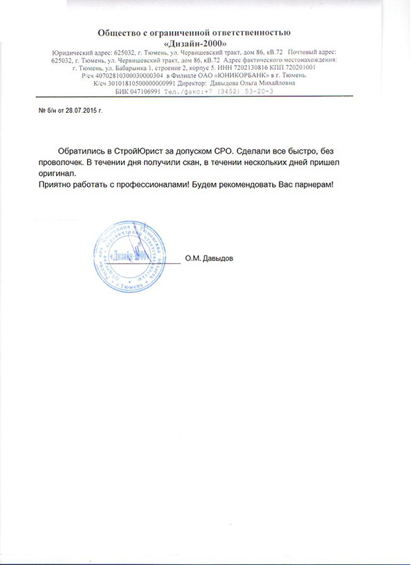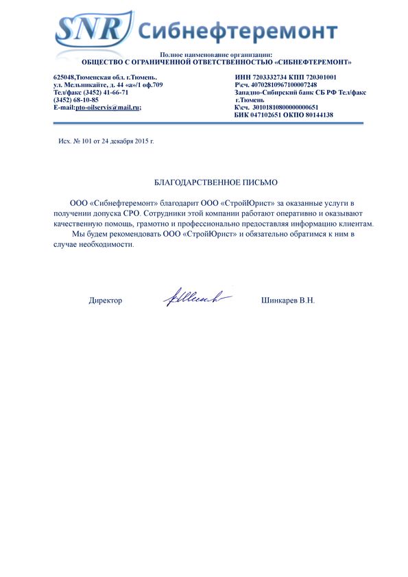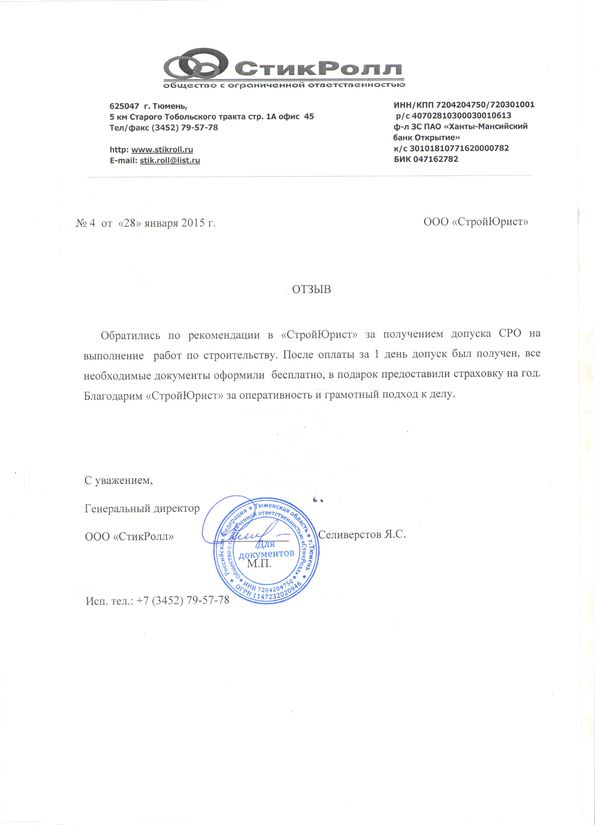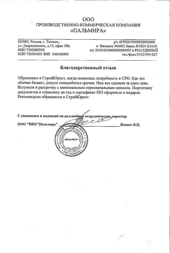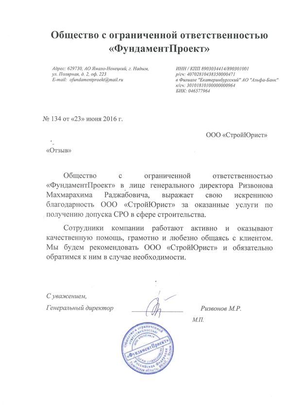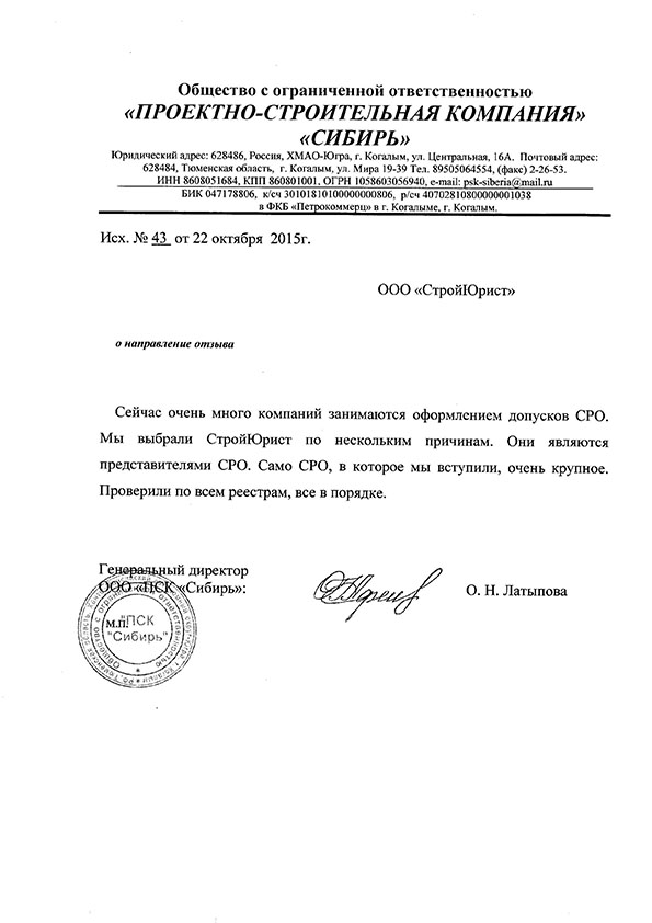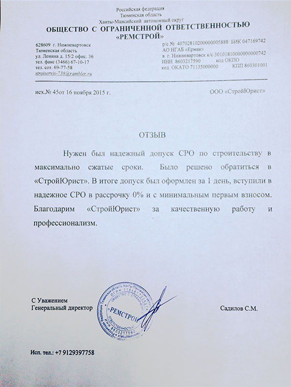Отзывы клиентов "СтройЮрист" по вступлению в СРО в Нягане