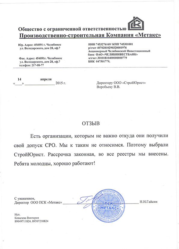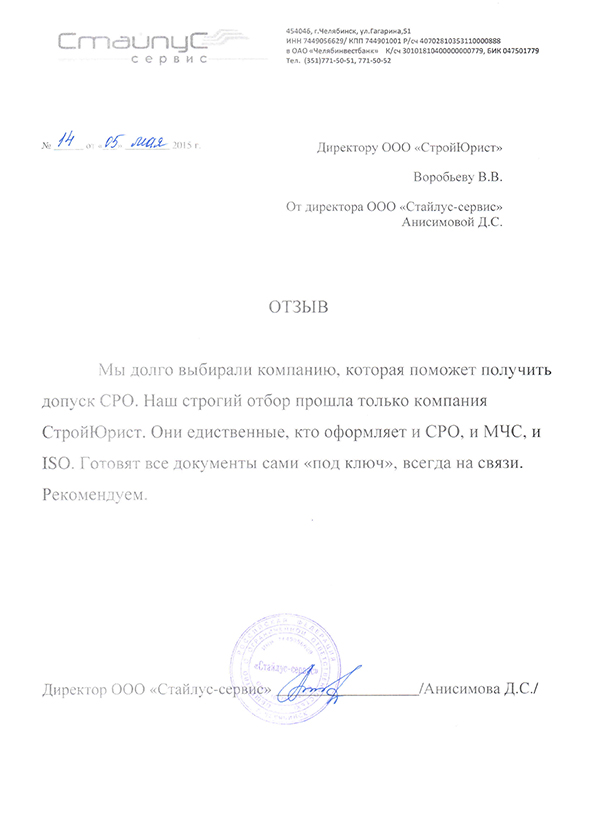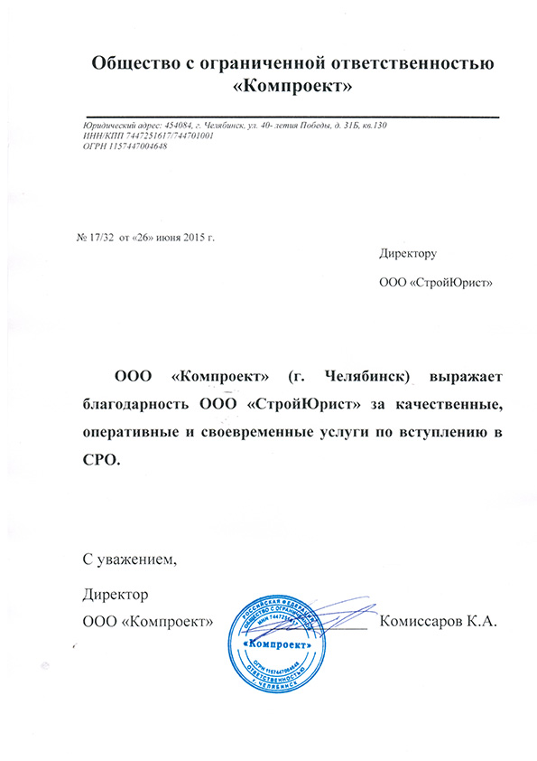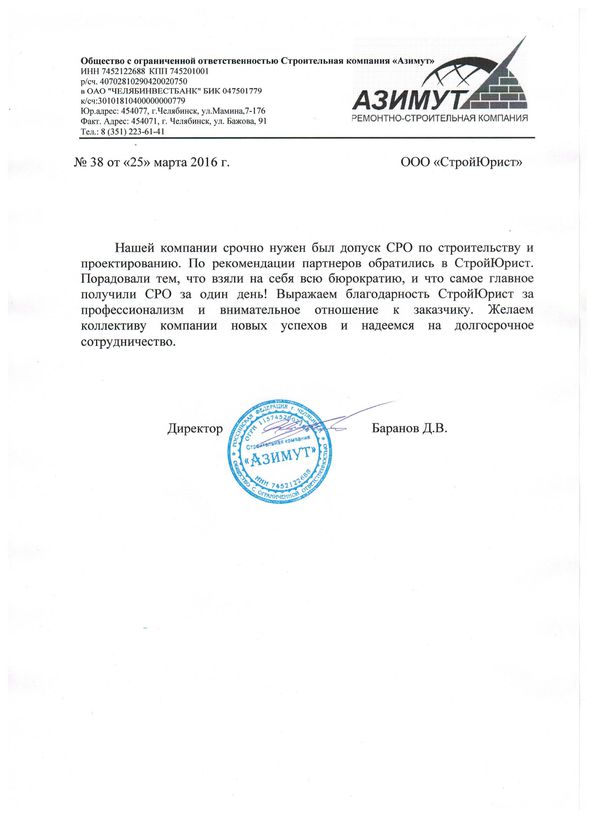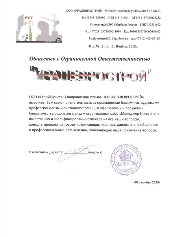 Отзывы клиентов "СтройЮрист" по вступлению в СРО в Нягане