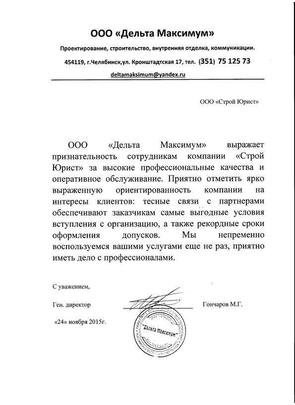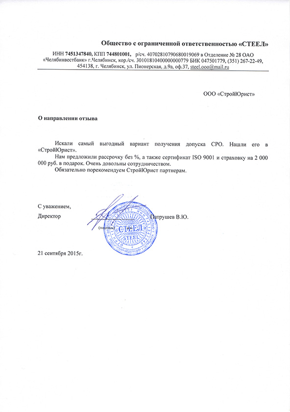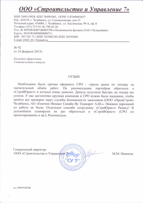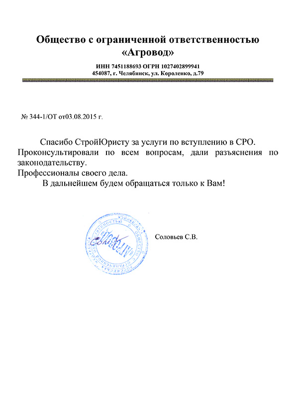 Отзывы клиентов "СтройЮрист" по вступлению в СРО в Нягане